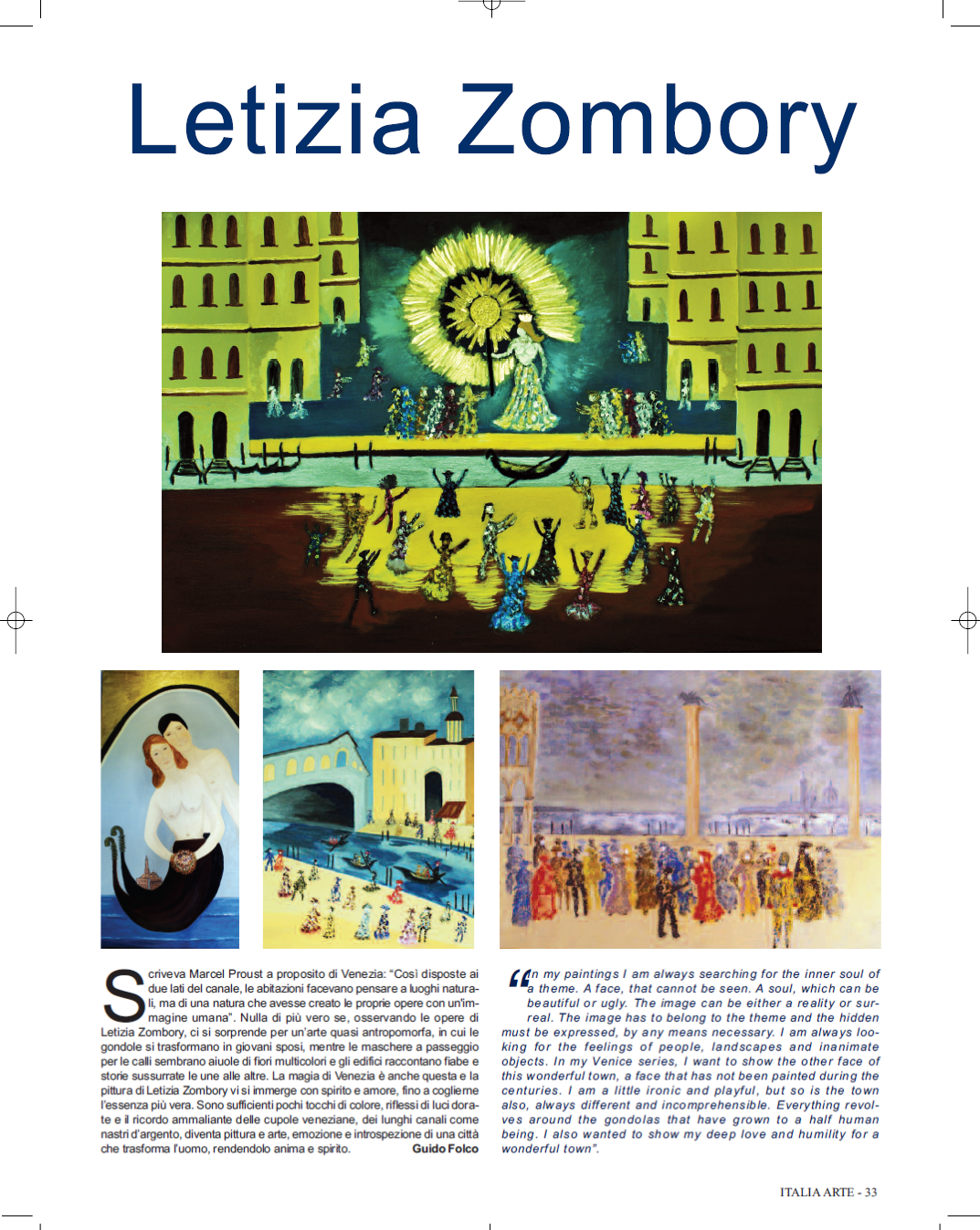 Marcel Proust wrote about Venice: “Situated on both sides of the channel, the houses remind us about the natural environment, but of a nature that had created their works with a human image.” Nothing could be more true if, looking at the works of Letizia Zombory, we are surprised by her almost anthropomorphic art, where the gondolas are transformed into young newlyweds, while the masks walking in the streets, the beds of colorful flowers and the buildings tell fairy tales and stories whispered to each other. The magic of Venice and this is also the painting of Letizia Zombory she creates with spirit and love, to grasp its true essence. With a few touches of color, reflections of golden lights and the haunting memory of the domes of Venice, the long channels like silver ribbons, becomes painting and art, emotion and introspection of a city that transforms man, making soul and spirit.